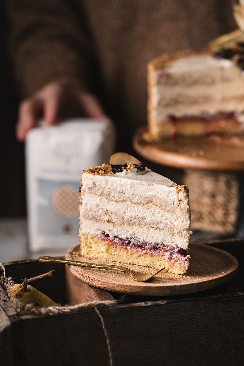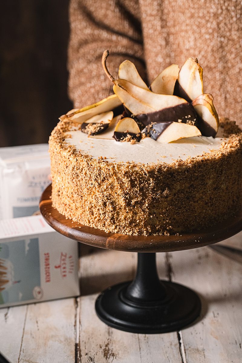10. Koláč potri zvyšným krémom a ozdob praženými lieskovými orechmi a čerstvými plátkami hrušky.