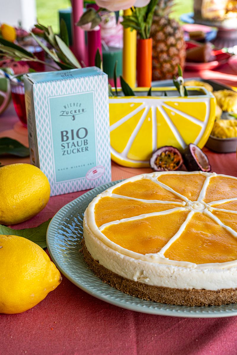 Na citrónové kontúry rozpusť bielu čokoládu a nechaj mierne vychladnúť. Pridaj jemný tvaroh a premiešaj. Čokoládovo-tvarohovú zmes naplň do jednorazového zdobiaceho vrecka, odstrihni špičku a na vychladený cheesecake nanes vonkajšie kontúry (pozri obrázok). Do vnútorných kontúr lyžicou nalej marakujový vrch. Pred podávaním nechaj dobre schladiť.